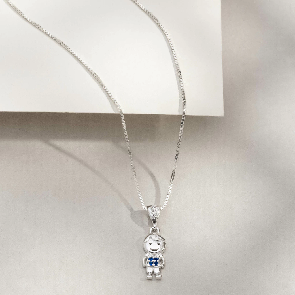 Este delicado colar em Prata 925 traz o pingente de um menino com zircônia azul cravejada, representando o amor materno, a pureza e a conexão eterna entre mãe e filho. Uma joia afetiva, perfeita para eternizar laços e momentos especiais.